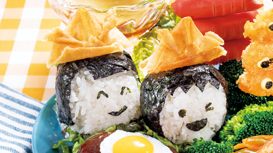ごはんは4等分してにぎり、焼き海苔で頭と顔のパーツを作って貼り、1をのせる。