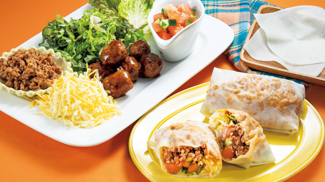 お皿に1~3と肉団子、チーズを盛り合わせる。