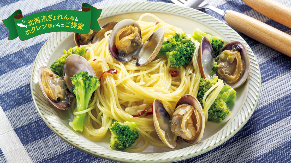 フライパンにオリーブ油と2を入れて弱火にかけ、香りが立ったら1を加えて中火でさっと炒める。冷凍のままのあさりを入れてさっと混ぜ、酒をふってふたをし、3~4分蒸す。