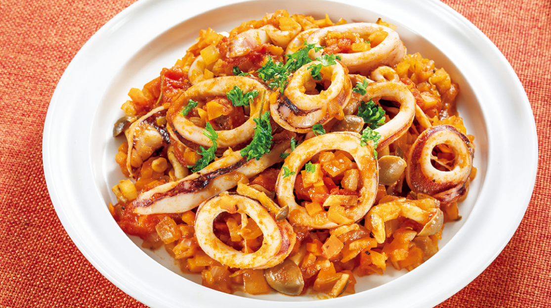 国産するめいかは袋の表示通りに解凍し、軟甲が残っていたら取り除いて表面の水気を拭き取り、1cm幅の輪切りにする。