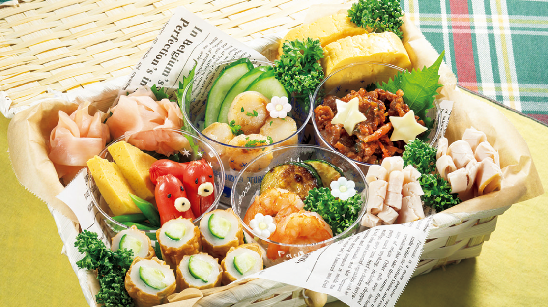 花ハム、厚焼き卵、ちくわきゅうり、ズッキーニのバター焼き、星形チーズ、漬物、パセリ、青じそなど ... 各適量