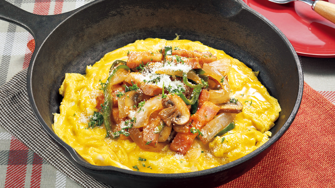フライパンにオリーブ油を入れて中火にかけ、1のベーコンから2までの材料を都度炒めながら順に入れていき、火が通ったらBを加えてサッと混ぜ合わせ、フライパンの中央に集める。空いた周りに3を回し入れて箸で少しかき混ぜながらスクランブルエッグになるまで火を通す。