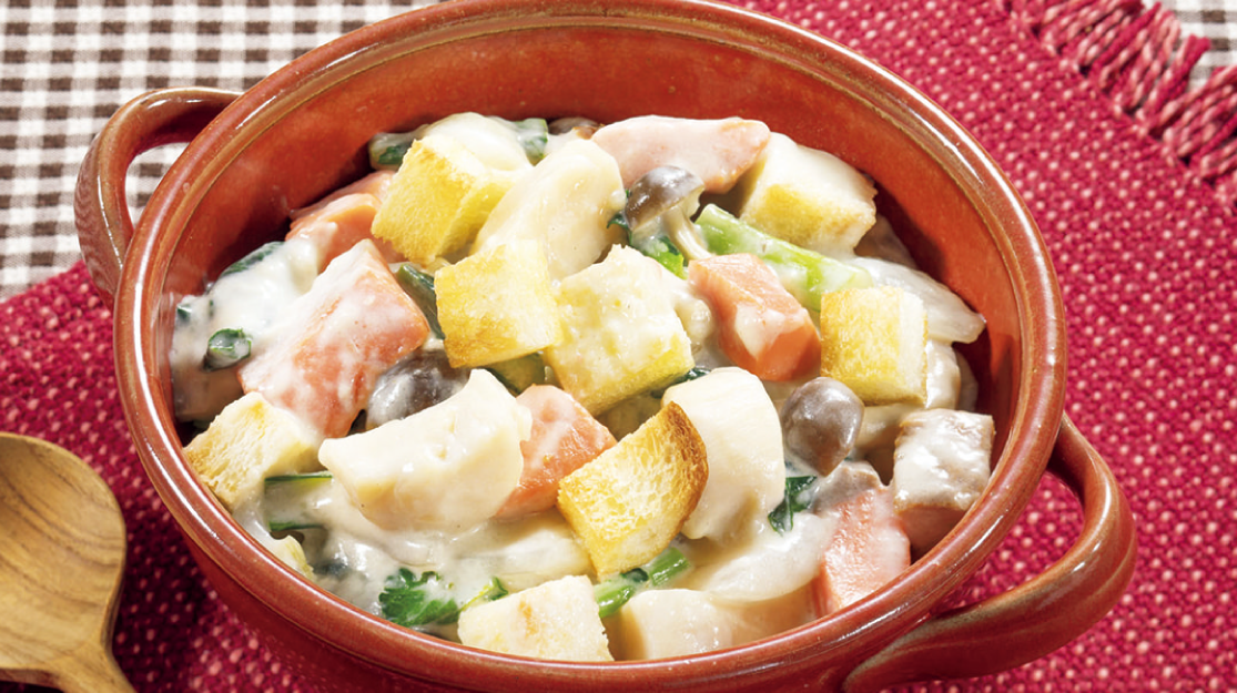 フライパンにAを入れて中火にかけ、香りが立ったら3を入れてしんなりするまで炒め、Bを加えて炒めながら混ぜる。粉っぽさがなくなったらCを加えてひと煮立ちさせる。