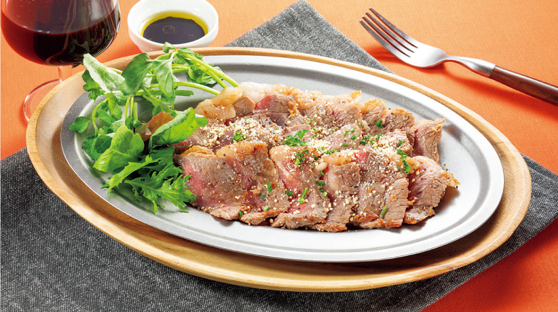 フライパンに1を液ごと入れて中火にかけ、片面1~2分ずつ(肉の厚さによって焼き時間は調整する)焼いてアルミホイルで包み、20分ほど置く。(ローストビーフを使う場合は3の工程から。ソースは付属品や市販品で。)