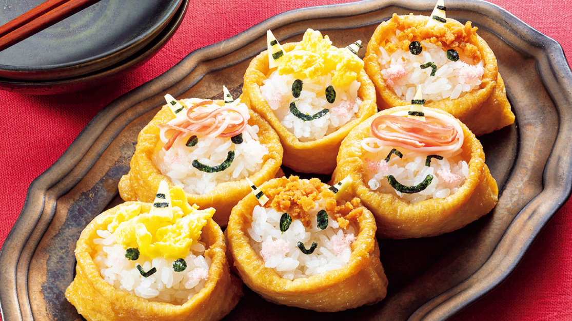 1のいなり2個ずつに2と3と肉そぼろをそれぞれのせて髪の部分を作り、4をのせる。白い酢飯の部分に海苔で目と口の模様をつけてさくらでんぶで頬を付ける。