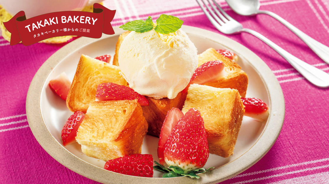 焼きたてのスイートデニッシュブレッドに、バニラアイス、フルーツを飾る。