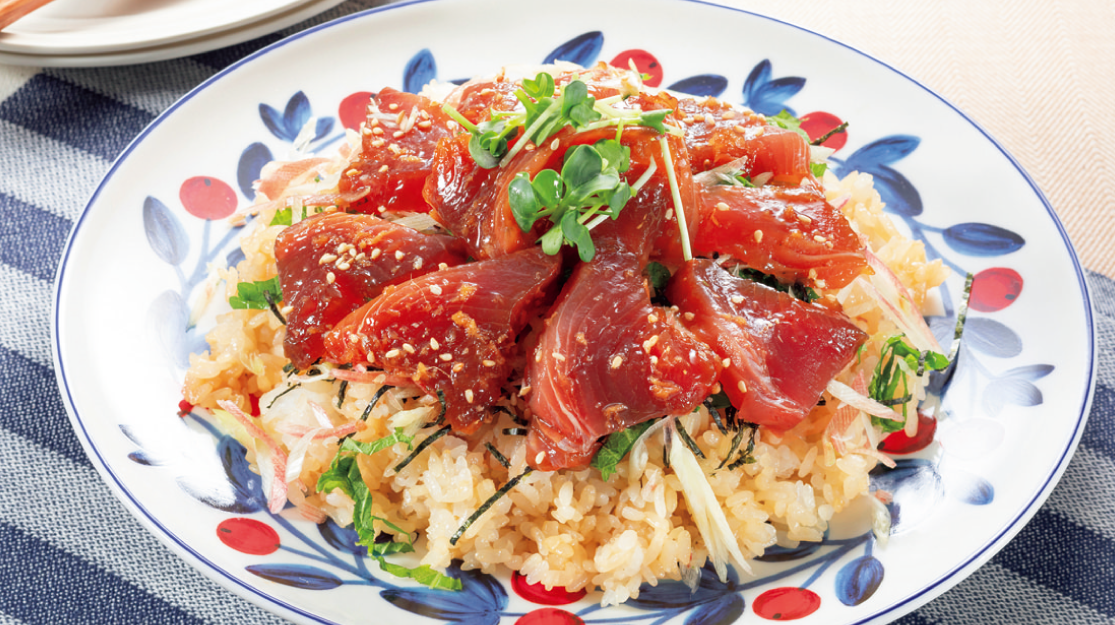 器に1を盛り、4と刻み海苔を散らして3をのせる。白ごまを振り、貝割れ大根を飾って完成。