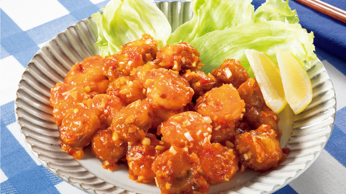 蒸しほたてとサラダえびはビニール袋に入れて片栗粉を加え、全体にまぶす。